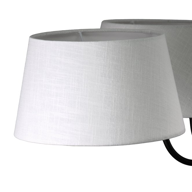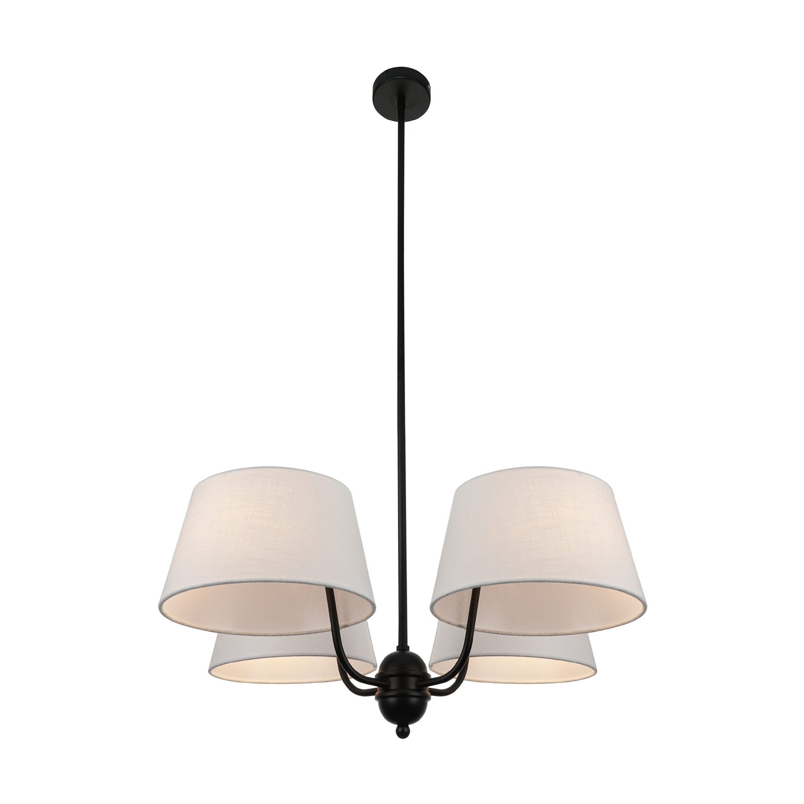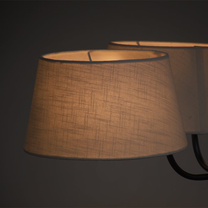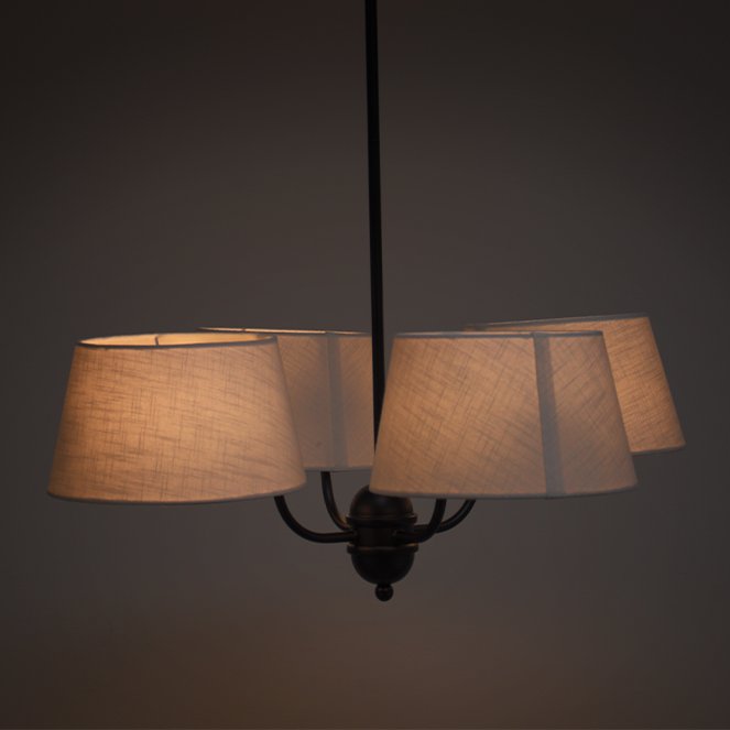 Os quatro abatjours cónicos em tecido bege criam uma iluminação suave e confortável, distribuindo a luz de forma equilibrada pelo espaço. A estrutura preta confere um visual moderno e sofisticado.