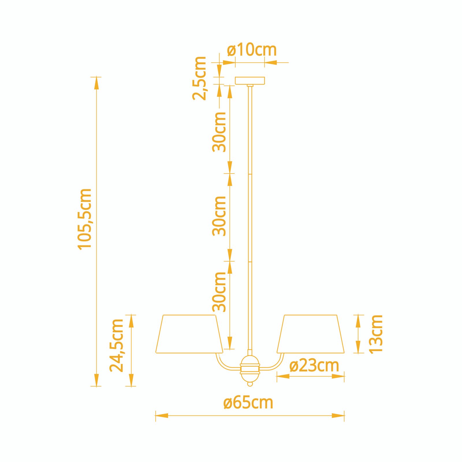 As medidas deste modelo de candeeiro de teto são 105,5cm de altura e 65 cm de diâmetro. Funciona com 4 lâmpadas E14, permitindo escolher diferentes temperaturas de cor conforme o ambiente desejado.
